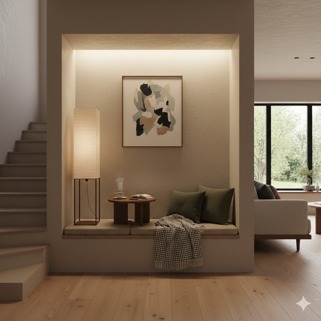 LDKの一角や階段下に作る「こぢんまりとした居場所」。2〜3畳の書斎を作る余裕がなくても、0.5畳〜1畳で読書やスマホに集中できるスペースとして流行しています。