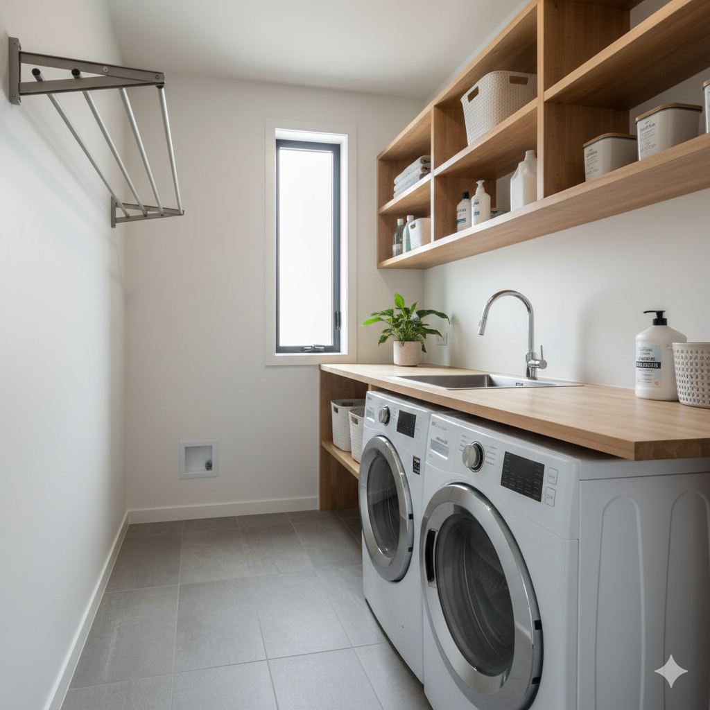 「洗う・干す・畳む」が1ヶ所で完結する部屋。花粉や黄砂対策で完全室内干し派が増えており、ベランダを作らない家も急増しています。